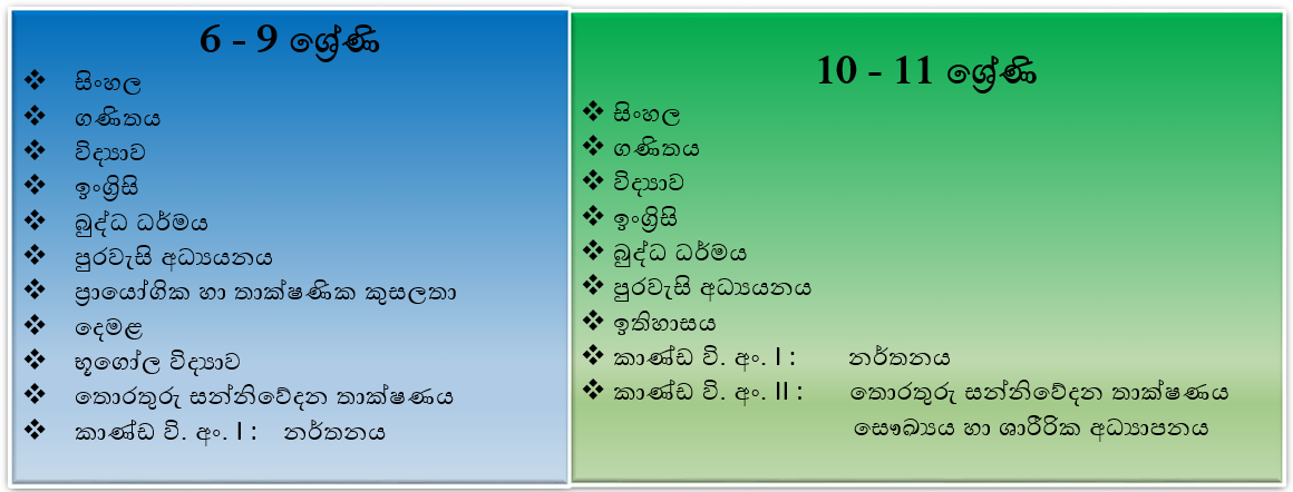 ද්විතියික අංශය 6 ශ්රේණියේ 11 සිට ශ්රේණිය දක්වා ක්රියාත්මක වේ. උසස් අධ්යාපනය සඳහා අවශ්ය මනා අවබෝධය නොඅඩුව ලැබිය යුතු මෙම අවධියේ සිසුන්ගේ විෂය හා විෂය බාහිර ක්රියාකාරකම් සංවර්ධනය සදහා කැපවූ ගුරු මව්පියවරුන් යටතේ පහත විෂයයන් ඔස්සේ ප්රාථමික අධ්යයන කටයුතු සිදුකෙරේ.